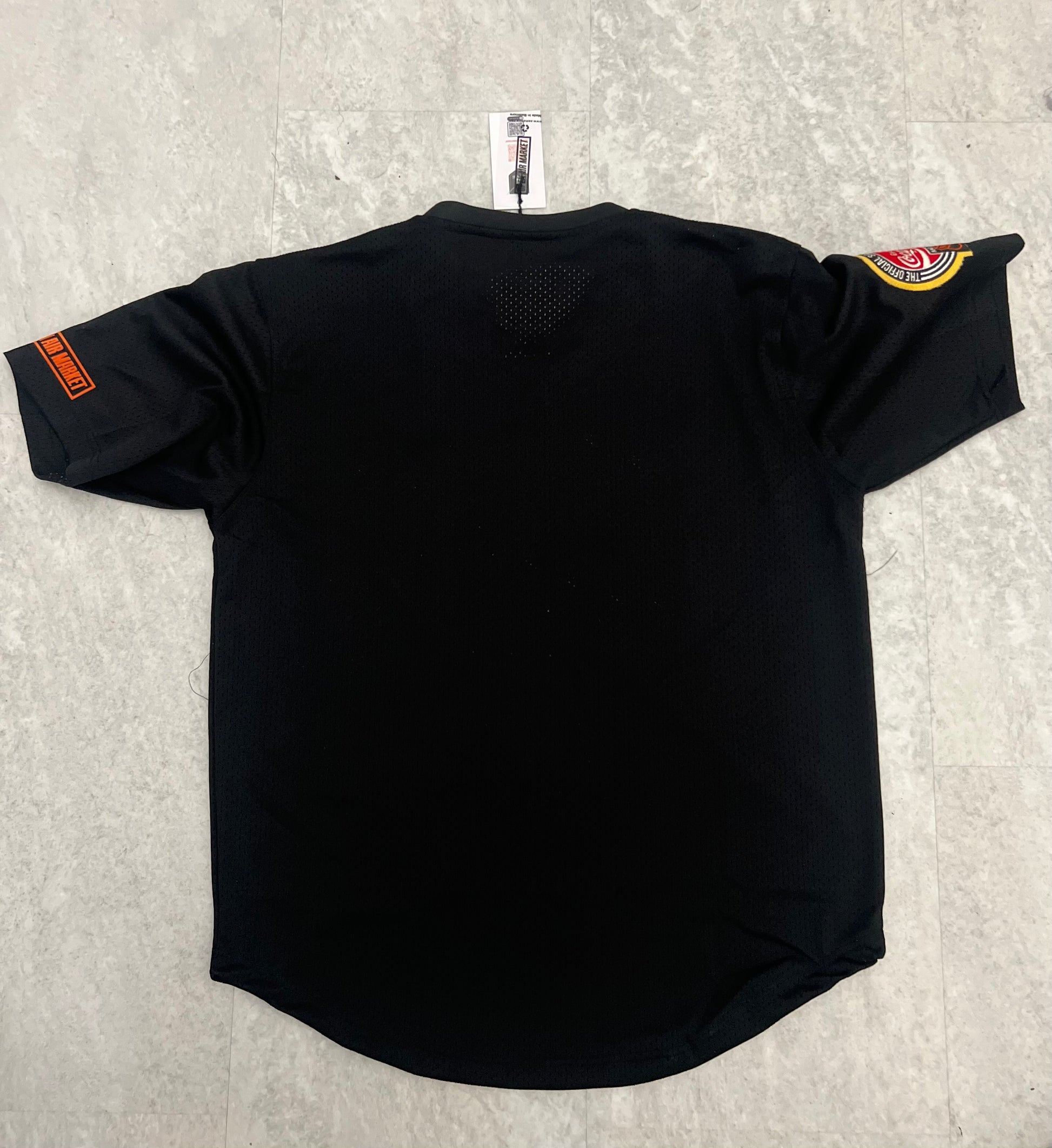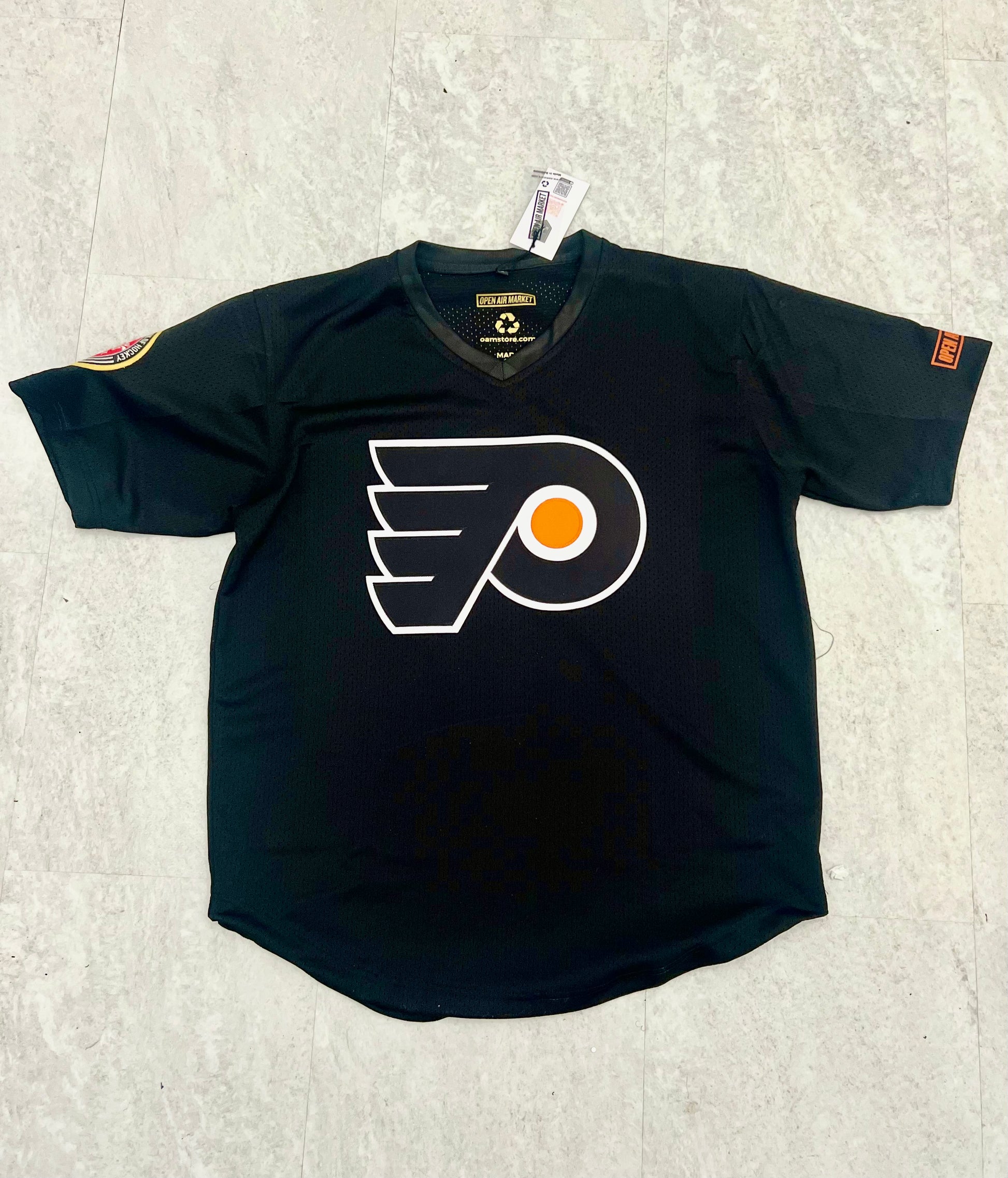 Black Cut and sew pullover baseball style jersey exclusively made for Open Air Market. Philadelphia Flyers appliqué full front and vintage NHL/Coke patch on sleeve with Open Air Market Flocking on opposite sleeve. This is a One of One size Large.