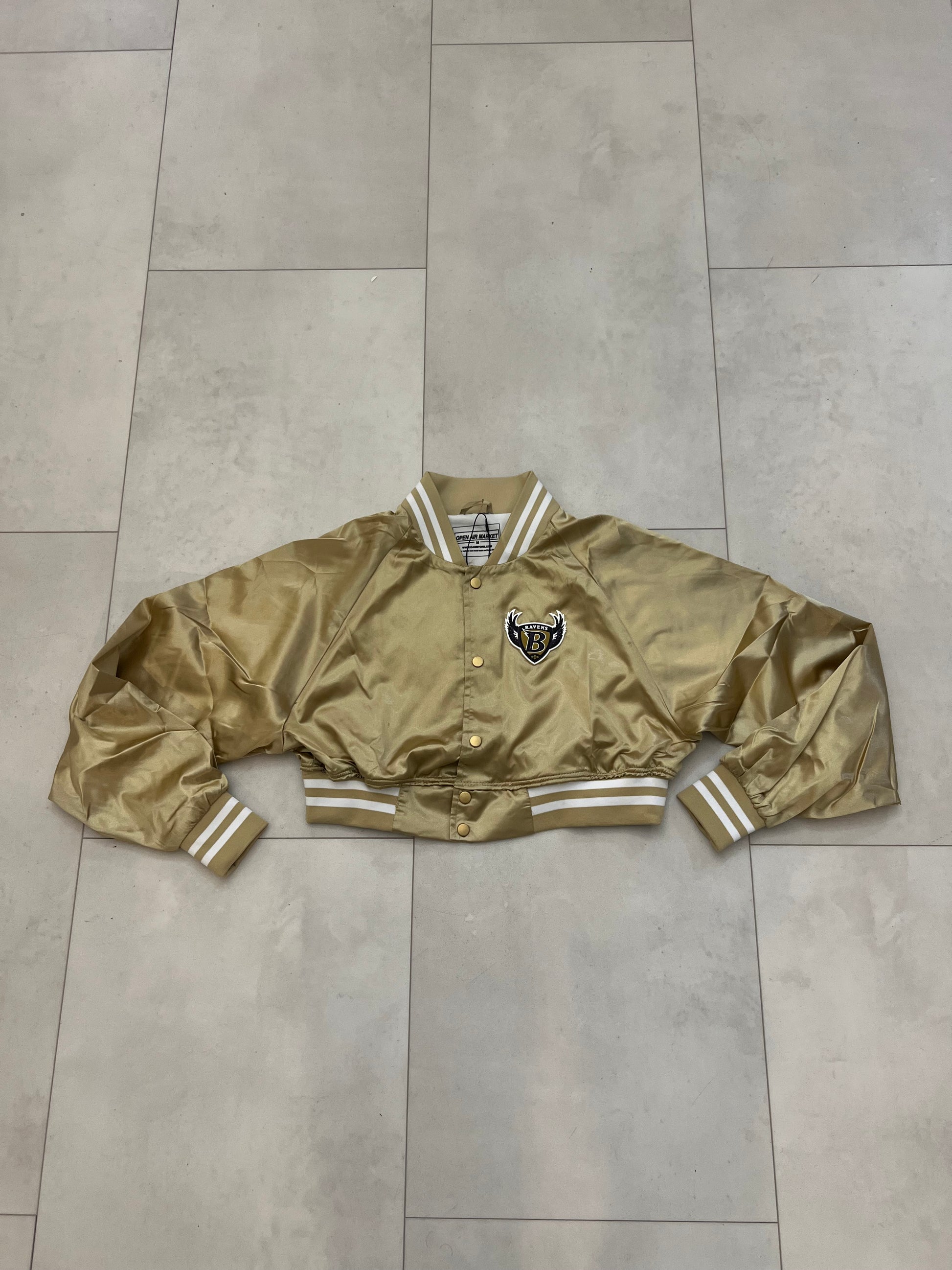 Professionally altered Gold sideline jacket with custom chenille patch on the back and matching front patch.